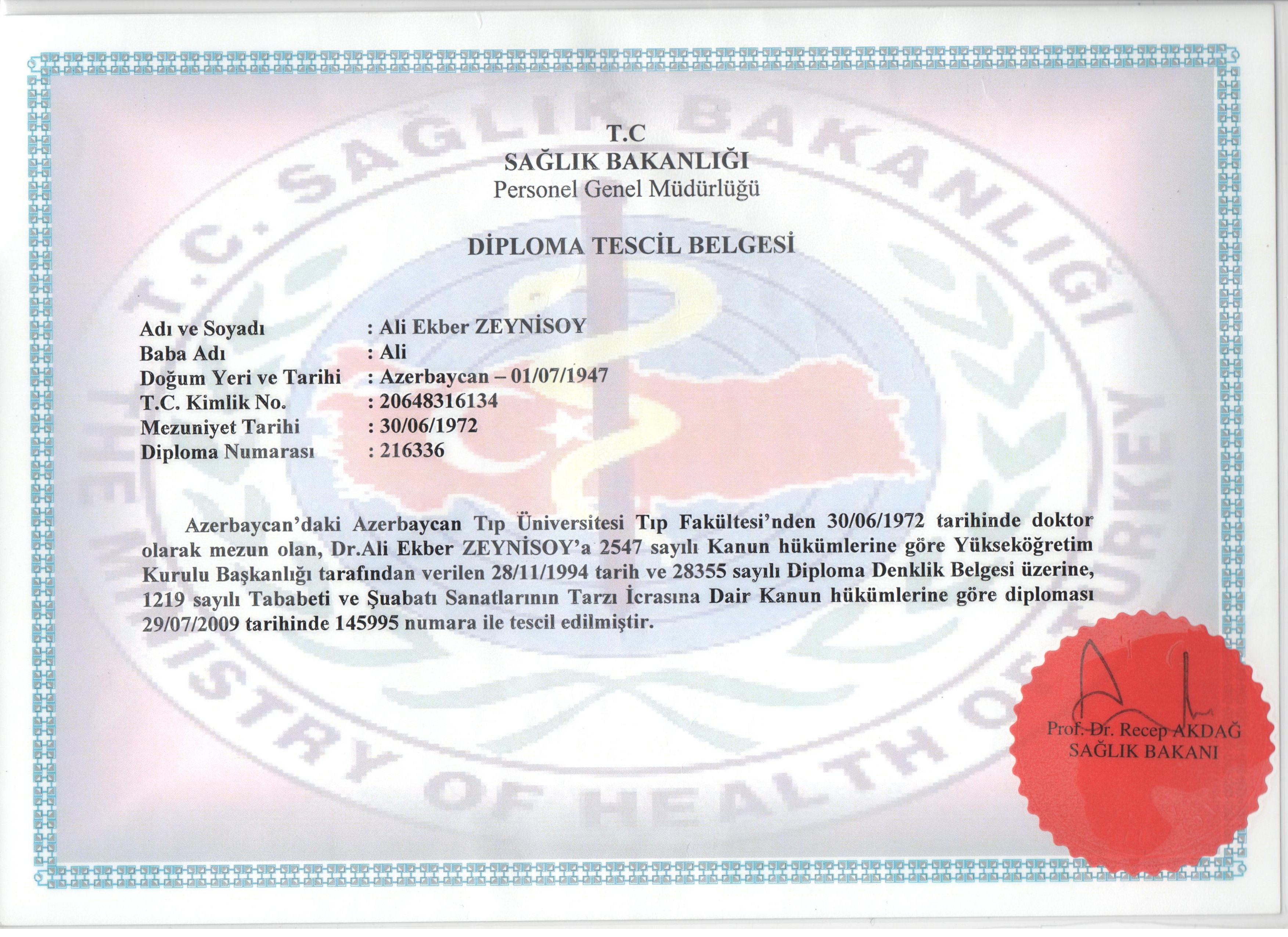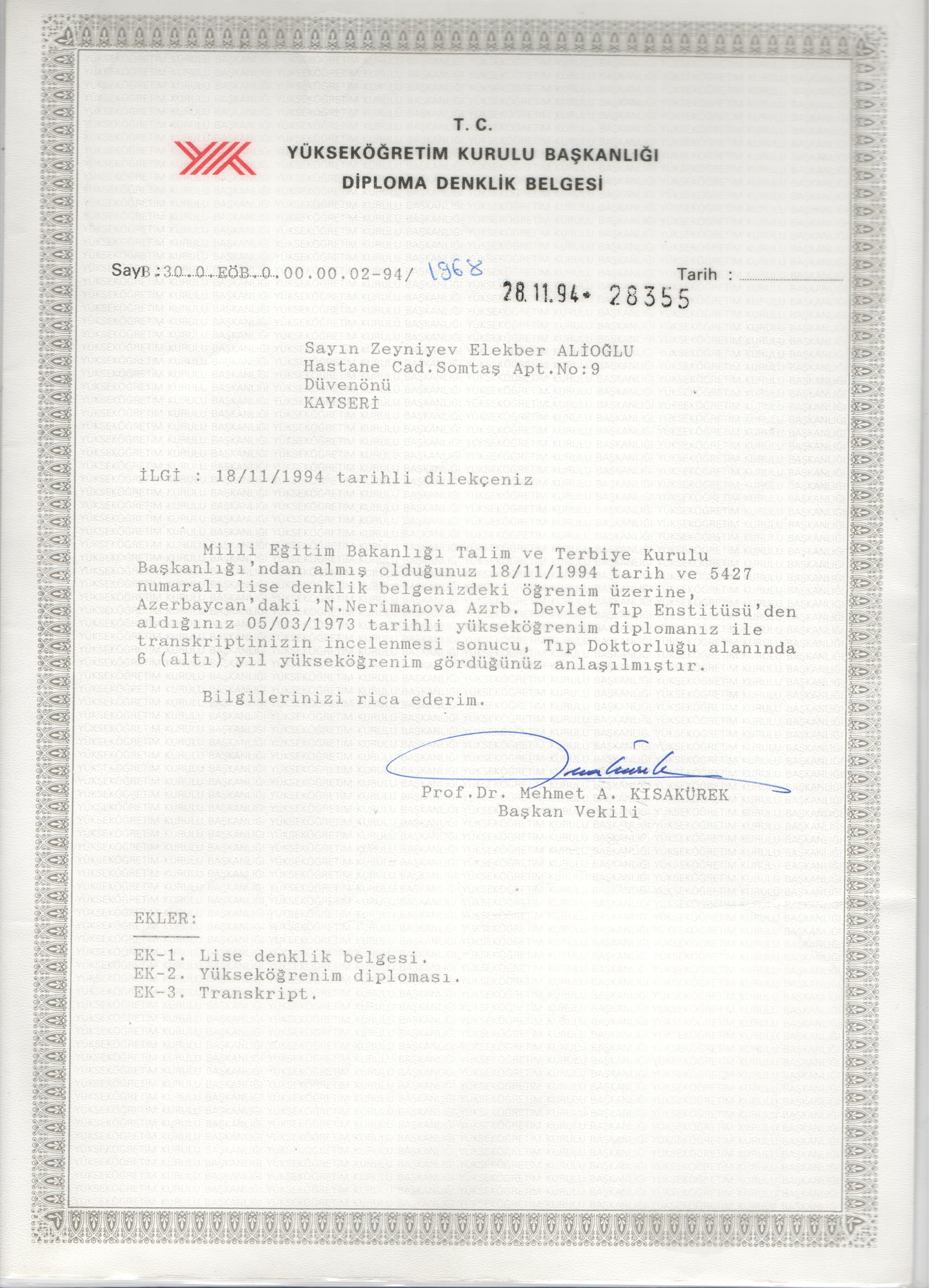 1994-də TC YÖK tərəfindən həkimlik diplomumun dənkliyi təsdiq edilmişdir.